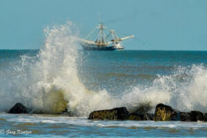 Subject – Waves crashing at Little Florida Beach with a shrimp boat in the background. - First Honorable Mention – Flock of Birds – submitted by Bernadette Miller Hudson
