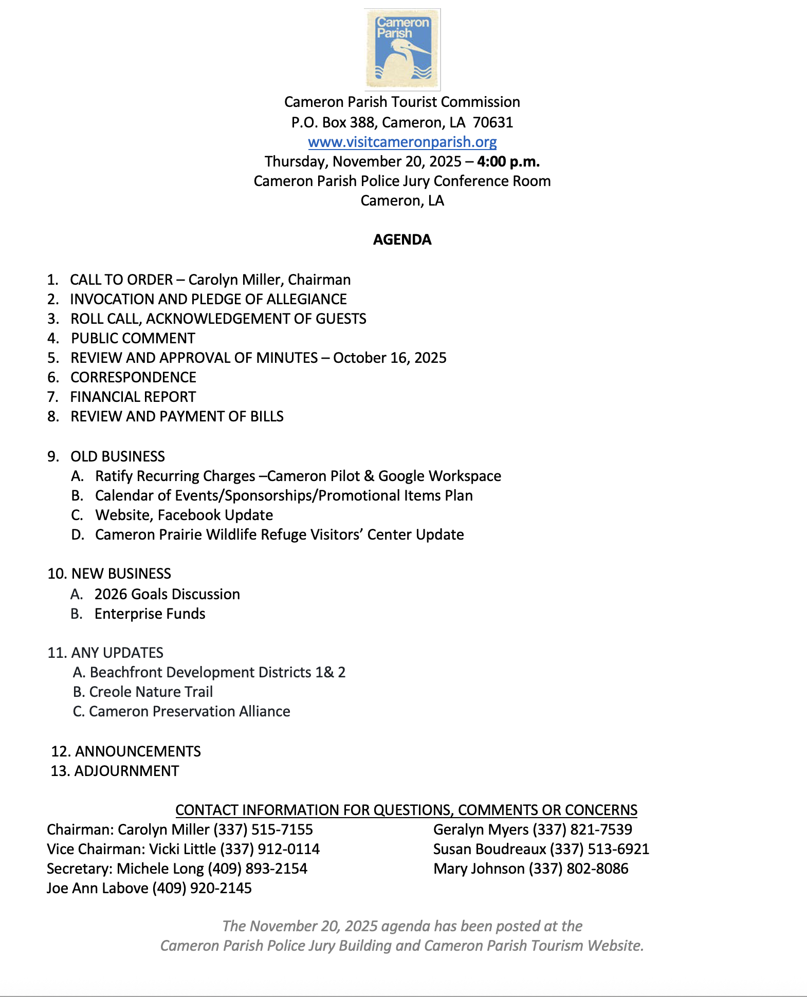 The November 20, 2025 agenda has been posted at the Cameron Parish Police Jury Building and Cameron Parish Tourism Website .